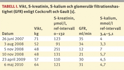 I november 2008 vid mitt första möte med denna kvinna var det omedelbara intrycket att jag stod inför en patient i slutstadiet av spridd tumörsjukdom, och min viktigaste uppgift nu var att försöka ordna så god omvårdnad för henne som möjligt. Trots sitt svaga tillstånd ville hon ovillkorligen tillbaka till sitt hem. Jag ombesörjde utökad hemtjänst, och daglig tillsyn av distriktssjuksköterska planerades. All medicinering (Atenolol 50 mg, Renitec 20 mg, Furix Retard 60 mg) sattes ut. Hon fick enbart behålla Waran. S-kreatinin och S-kalium mättes. Efter ett par timmar, då patienten redan åkt hem, kom telefonsamtal från kemilaboratoriet till vårdcentralen. S-kalium var 7,0 mmol/l och S-kreatinin 223 µmol/l. (Några månader tidigare låg dessa prov inom normala referensområden; i augusti 2008 noterades sänkt S-natrium: 132 mmol/l.)