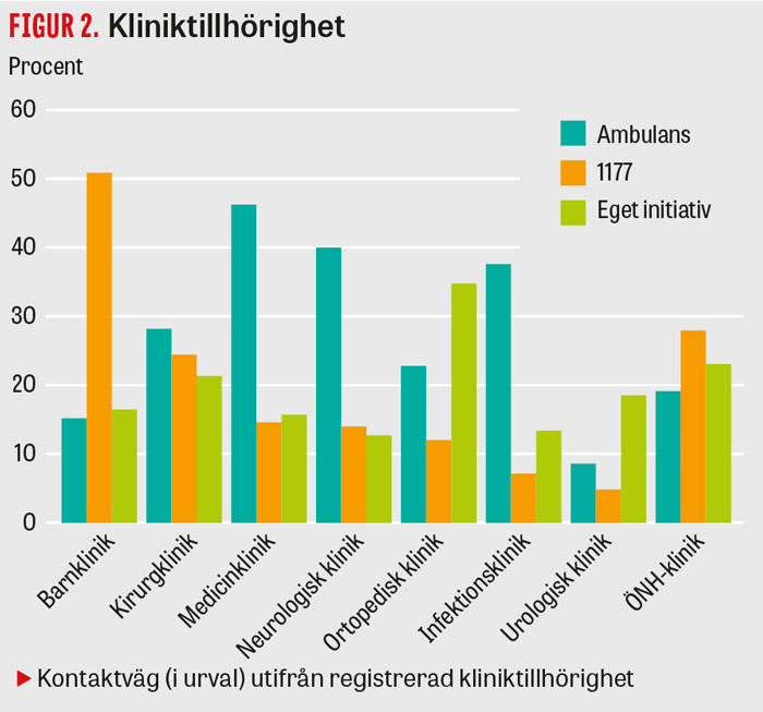 Av samtliga patienter i studiepopulationen hade 763 stycken (19,6 procent) sökvägen »Eget initiativ« registrerad. Övriga 3 122 (80,4 procent) hade en sjukvårdskontakt registrerad som sökväg. Fördelningen mellan olika sökvägar framgår av Figur 1, och fördelningen ifråga om ålder och kön av Tabell 1. Fördelningen mellan olika kontaktvägar (i urval) utifrån patientens registrerade kliniktillhörighet framgår av Figur 2. Förhållandet mellan hög initial triagefärg (röd och orange) och inläggningsfrekvens för respektive sökväg framgår av Figur 3. Skillnaden mellan sökvägen »Ambulans« och övriga sökvägar var statistiskt signifikant i fråga om såväl inläggningsfrekvens (55,2 respektive 22,8 procent, P < 0,05) som hög initial triagefärg (46,9 respektive 15,2 procent, P < 0,05). Skillnaden mellan sökvägen »Eget initiativ« och övriga sökvägar (sökvägen »Ambulans« exkluderad) var statistiskt signifikant i fråga om hög initial triagefärg (20,4 respektive 14,5 procent, P = 0,006), men inte ifråga om inläggningsfrekvens (24,5 respektive 22,5 procent, P = 0,189). Andelen patienter som hänvisats via olika telefonalternativ (»1177«, »Hänvisad vårdcentral«, och »Hänvisad USÖ«) uppgick till 29,5 procent.