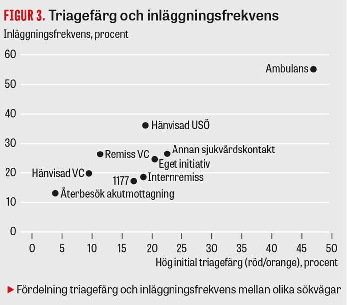 Patienter som ankom med ambulans utgjorde den enskilt största gruppen ifråga om sökväg, och särskilde sig från övriga i fråga om såväl inläggningsfrekvens som initial triagefärg. Vår undersökning visar därutöver att olika telefonhänvisningsalternativ stod för nära 30 procent av alla akutbesök. Den medicinska allvarlighetsgraden för denna patientgrupp var förhållandevis låg. Detta skulle kunna uttolkas som att telefonhänvisning på systemnivå överutnyttjar akutmottagningen för patienter som inte bedömts behöva ambulanstransport. Telefonhänvisning skulle i så fall bedömas ur ett systemperspektiv, och syfta mot vidareutveckling och kvalitetssäkring av beslutsstöd och hänvisningsrutiner. En annan tolkning skulle kunna vara att akutmottagningarna bör utveckla en bedömnings- eller triagemodell som kompletterar telefonbedömningen i fråga om vårdnivå och angelägenhetsgrad. Sådana modeller måste i så fall vara kvalitetssäkrade och validerade för att garantera medicinsk säkerhet [13]. En tredje möjlighet skulle vara att vidareutveckla akutmottagningens förmåga att omhänderta ett patientklientel med mycket stor spännvidd i fråga om medicinsk angelägenhetsgrad, exempelvis genom satsningar på akutläkarorganisation eller samorganisation med primärvårdsjour. Oavsett tolkning förefaller telefonhänvisningens betydelse för patienttillströmningen till akutmottagningen vara påfallande dåligt genomlyst ur både vetenskapligt och verksamhetsmässigt perspektiv.