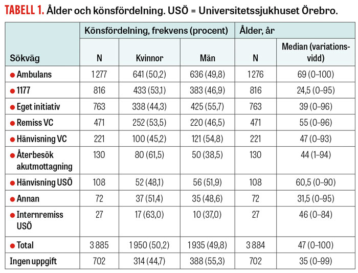 Under studieperioden registrerades totalt 5 934 patientbesök, motsvarande i medeltal 160,4 besök per dag. I 1 347 (22,7 procent) av fallen fanns inte någon sökväg registrerad, och i ytterligare 702 (11,8 procent) fall hade sökvägen »Ingen uppgift« registrerats. Dessa besök exkluderades från vidare beräkningar. Undersökningen omfattade därmed totalt 3 885 akutbesök, motsvarande 65,5 procent av det totala antalet besök under perioden. När grupperna utan respektive med registrerad sökväg jämfördes, identifierades skillnader i fråga om ålder (medianålder 35 [0–99] år respektive 47 [0–100] år) och kön (44,7 respektive 50,2 procent kvinnor).