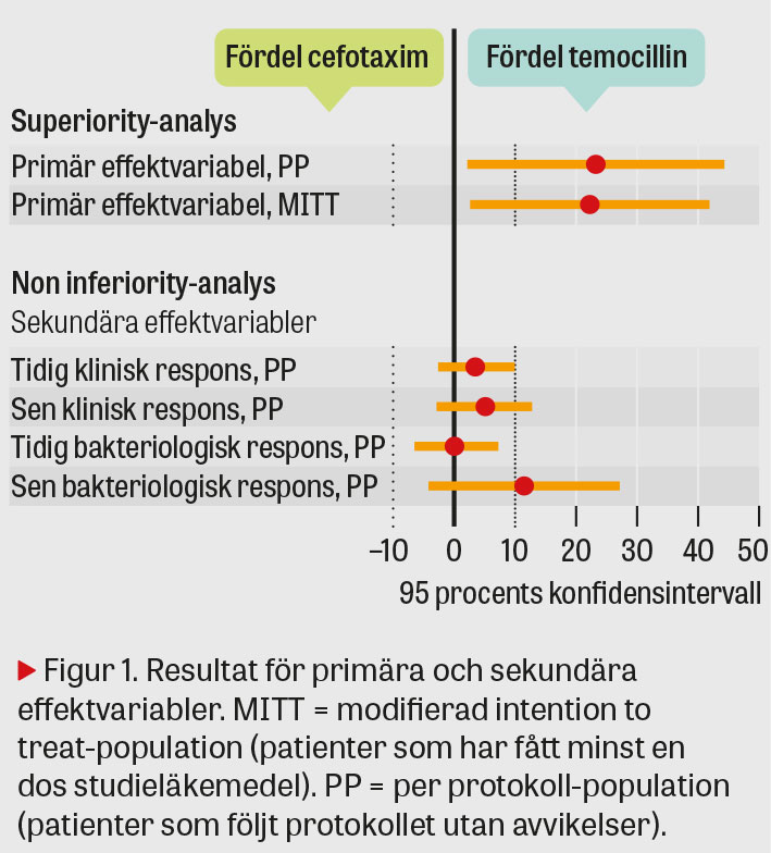 Studien pågick mellan 2016 och 2019, och 152 patienter med febril urinvägsinfektion inkluderades. Studien visade att behandling med temocillin ledde till lägre ekologisk störning i mikrobiotan, främst på grund av färre antibiotikaresistenta bakterier i tarmen, jämfört med cefotaxim. Den primära effektvariabeln uppfylldes av 18/68 (26 procent) i temocillingruppen och 30/62 (48 procent) i cefotaximgruppen (riskskillnad –22 procent; 95 procents konfidensintervall –42 till –3 procent). Non-inferiority påvisades mellan behandlingsgrupperna för klinisk och bakteriologisk effekt, både tidigt (dag 3–4) och sent (7–10 dagar) efter avslutad antibiotikabehandling (Figur 1). Upplevda biverkningar var likvärdiga mellan grupperna. Detta är den första randomiserade kliniska studien av temocillin där den av EUCAST nyligen rekommenderade dosen 2 g × 3 studerats.