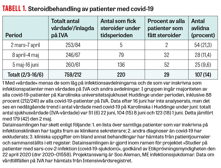 Första patienten med covid-19 blev inlagd den 2 mars. Den 19 mars ordinerades steroider på indikation covid-19 för första gången. I Tabell 1 redovisas antalet behandlade patienter samt den totala mortaliteten. Initialt diskuterades insättningen av steroider patient för patient i infektionsläkarkollegiet. I takt med att erfarenheten av behandlingen ökade och vi observerade att många patienter svarade bra på steroider med sänkning av inflammation och syrgasbehov, blev steroidbehandling mer rutinmässig. De patienter som blev aktuella för behandling med steroider hade vanligen ett syrgasbehov på minst 4 l/min, oftast i ökande, samt tecken på hyperinflammation i form av kraftigt förhöjda biokemiska markörer såsom CRP, ferritin, IL-6, LD och/eller D-dimer. Gränsen på 4 l syrgas/minut baserades enbart på den kliniska observationen att många patienter med ett lägre syrgasbehov ofta förbättrades utan steroider, varför risken för biverkningar bedömdes som större än den potentiella nyttan. Steroiddosen var vanligen betametason 4 mg × 1, men dosering har varierat mellan 2–8 mg en och mer sällan två gånger dagligen beroende på patientens syrgasbehov, antalet sjukdagar i covid-19 och inflammatoriska parametrar. Hänsyn har också i viss mån tagits till patientens ålder och bakomliggande sjukdomar [20-22]. Total behandlingstid har styrts av klinisk respons: vid snabbt svar har dosen vanligen halverats efter cirka 3 dagar och behandlingen avslutats efter ytterligare 3–4 dagar.