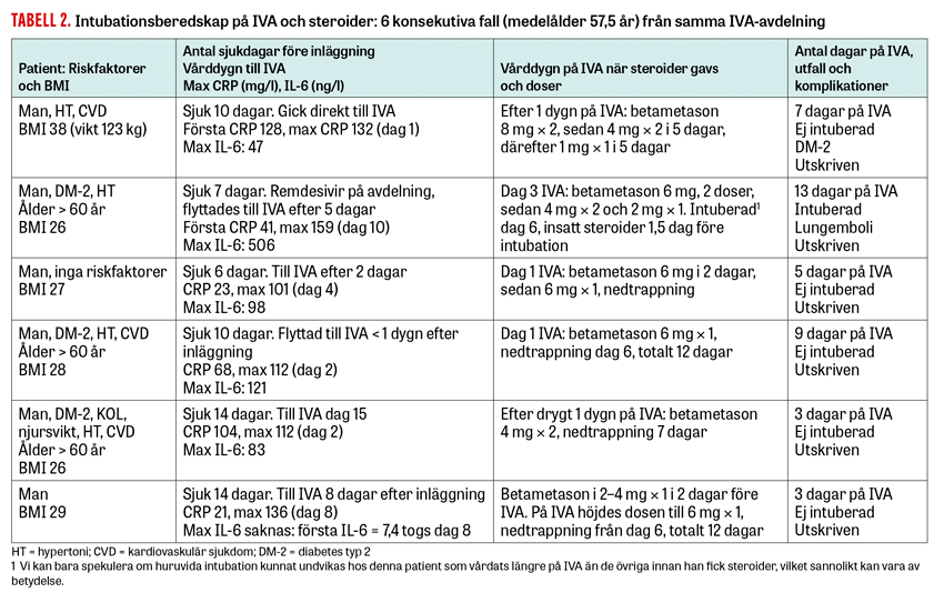 Från mitten av april och framåt har betametason 4–8 mg × 1–2 eller 1 mg/kg/dag av metylprednisolon (eller 125 mg 1 gång dagligen i upp till 3 dagar), baserat på bland annat vikt och grad av inflammation, satts in av infektionskonsulterna på IVA till icke-intuberade patienter med syfte att förhindra progress till intubation. För att illustrera detta redovisas sex konsekutiva patientfall som var inlagda för intubationsberedskap på IVA (Tabell 2). Behandlingstiden har oftast varit 5–10 dagar med halvering av dosen efter 5 dagar hos dem som har fått 10-dagarsbehandling.