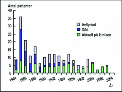 På vår klinik har antalet patienter som har insjuknat och dött i opportunistiska infektioner och tumörer minskat betydligt (Figur 1). Under de första tio åren diagnostiserade vi aids vid 62 tillfällen, att jämföra med 13 de senaste tio åren (Tabell I). Aidsdiagnos ges till patienter som vid något tillfälle har haft en opportunistisk infektion, en tumör eller HIV-komplikation enligt den klassifikation som Centers for Disease Control and Prevention (CDC) i USA upprättat [2]. Arbetet under de senaste åren har dominerats av den handläggning som den komplicerade tablettbehandlingen kräver. Diskussion med patienten om att starta med antiretroviral behandling initieras vid snabb sjukdomsprogress, symtom, eller när värden för CD4 går under 300 celler/mikroliter. Patienterna behandlas med minst tre olika preparat av de tjugo läkemedel som nu finns registrerade. Behandlande läkarens kunskap och erfarenhet gällande medicinernas verkningsmekanismer, interaktioner, resistensutveckling och biverkningsmönster är helt avgörande för hur behandlingen lyckas. Patienterna måste vara väl informerade och införstådda med hur behandlingen fungerar och med nödvändigheten av att inte missa någon enda dos. De patienter som bedöms inte kunna följa behandlingen bör hellre vänta då risken annars är stor för resistensutveckling, vilket i sin tur helt kan ödelägga en framtida möjlighet att behandla [3]. Bland biverkningar är det magbesvär, förhöjda blodfetter, diabetes, fettansamling och fettatrofi som patienterna drabbas av. Patientbesöken domineras nu helt av problem kring behandling och biverkningar.