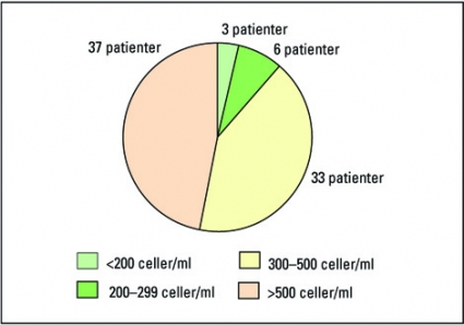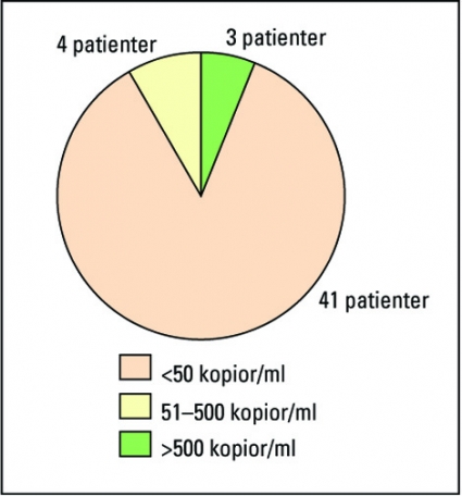 Sedan vår verksamhet startade 1984 har 209 patienter varit inskrivna hos oss kortare eller längre tid. Patientgruppen utgörs av personer som diagnostiserats på vår klinik och HIV-positiva patienter som remitterats eller själva sökt upp oss. Av de 209 patienterna har 145 fått sin diagnos av oss. I Figur 2 visas när patienterna diagnostiserades och hur situationen är för dem idag. Antalet inskrivna patienter som är under kontroll eller behandling har under dessa 20 år nästan konstant varit mellan 70 och 80 patienter. Statistiken som redovisas här gäller de 79 patienter som var inskrivna 1 juni 2004. 42 av dessa patienter har varit smittade i mer än tio år. Av de 79 patienterna är 66 följda på vår klinik sedan de fått diagnos. Homo-/bisexuella män utgör 77 procent av gruppen, heterosexuella män 15 procent och kvinnor 8 procent. Gruppens immunstatus är gott med bara 2 patienter som har CD4-värden under 200 celler/mikroliter. Behandling med HAART (highly active antiretroviral treatment) ges till 48 patienter. Ett vedertaget sätt att bedöma kvaliteten på behandlingen är att se hur många av de behandlade som har mindre än 50 kopior HIV-RNA/ml. I vår grupp var det vid det aktuella mättillfället 85 procent som hade omätbara nivåer (Figur 4). Detta är i nivå med behandlingsresultaten på landets största HIV-mottagning på Karolinska Universitetssjukhuset Huddinge [4]. Bland de patienter som inte uppnår omätbara nivåer görs en noggrann genomgång av de faktorer som kan vara orsak till detta, såsom dålig följsamhet, interaktioner och resistensutveckling.