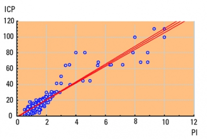 Med upprepade karotisdopplermätningar undersökte Steiger [13] PI hos patienter med svår skallskada och jämförde resultaten med dem hos friska frivilliga. Denna extrakraniella applikation av PI visade värden på 1,5–2,0 hos kontrollgruppen med en gradvis ökning hos patienter med posttraumatisk hjärnsvullnad. PI-värden över 3 var associerade med uttalad intrakraniell hypertension, och i fall av angiografiskt verifierad upphörd cerebral cirkulation fann man PI-värden mellan 6 och 8. I den aktuella studien visas en signifikant korrelation mellan PI och ICP. Korrelationen är starkare än i tidigare studier.