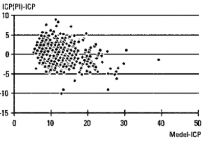 I hela materialet fann man en stark, signifikant korrelation (P<0,0001) mellan ICP och PI med en korrelationskoefficient på 0,938 (Figur 1). Det var endast i ICP-intervallet 5–40 mm Hg som data var normalfördelade runt regressionslinjen. Vid uteslutning av upprepade mätningar, enbart inkluderande den initiala PI-registreringen hos varje individ (n=81) för intervallet 5–40 mm Hg, blev R2 0,733 (P<0,0001) med en SD på 2,5. Regressionslinjen är ICP(PI) = 11,1 ¥ PI – 1,43. Vid applikation av regressionsekvationen får man ICP(PI) = ICP ± 2,5 (SD) med ett 95 procents konfidensintervall på ± 4,2. Bland–Altmans test av alla mätningar konfirmerade att skillnaden mellan det observerade ICP och ICP förutspått från PI är inom ± 4,2 av det observerade ICP (Figur 2). I ICP-intervallet 0–20 mm Hg hade metoden för alla mätningar en sensitivitet på 0,88 och en specificitet på 0,69. För enbart de första mätningarna var sensitiviteten 0,91 och specificiteten 0,79 för upptäckt av ett ICP >10 mm Hg.