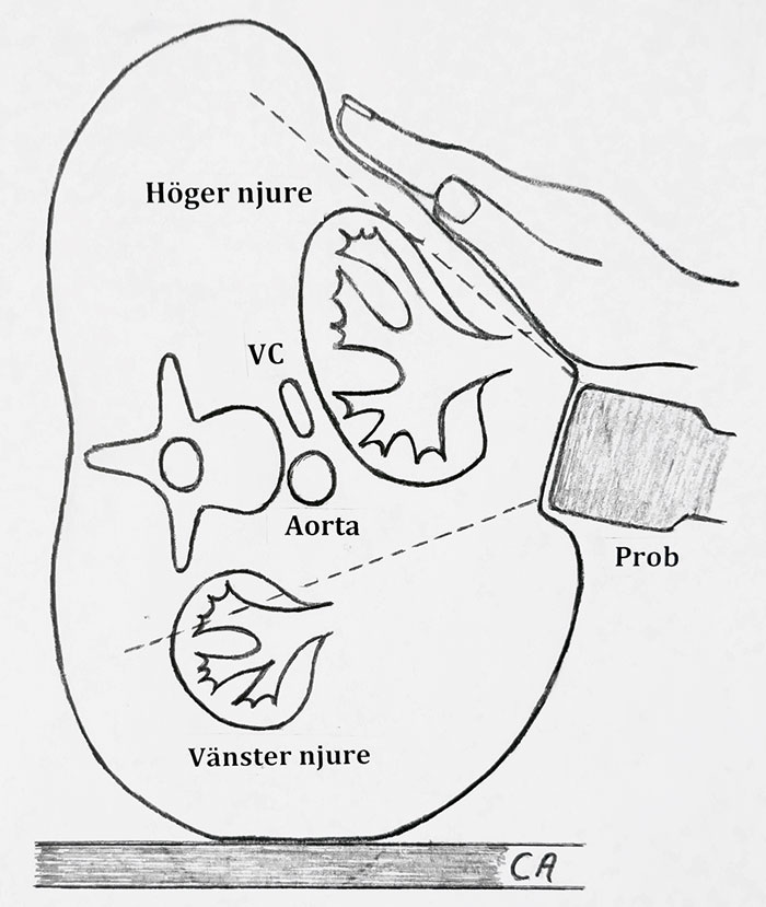 Figur 1. Schematisk bild av ultraljudsundersökning med den kaudalt förflyttade och roterade högra njuren liggande transversellt framför vena cava (VC) och aorta. Bild: Conny Arnerlöv