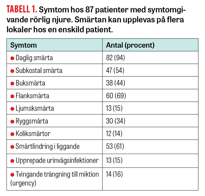 Mellan 1989 och 2018 opererades 87 patienter, varav 83 kvinnor, med symtomgivande rörlig njure och uttalade besvär sedan mer än 1 år. Medelåldern var 38 år (17–69 år). Patienternas symtom redovisas i Tabell 1.