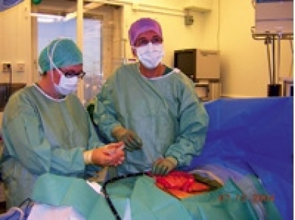 Peroperativ enteroskopi. Av de 17 laparotomierna utfördes 8 på Södersjukhuset. Eftersom nivådiagnostiken av tumörer är osäker vid kapselendoskopi fanns beredskap för sk peroperativ enteroskopi. En enterotomi utfördes mitt på tunntarmen, varefter ett pediatriskt koloskop (Olympus 160) fördes in i tunntarmen (Figur 4). Som framgår av bilden användes ren men osteril teknik, dvs endoskopet kläddes inte in sterilt. En av oss förde därefter in instrumentet först i oral riktning fram till ventrikeln och därefter i distal riktning ut genom ileocekalklaffen. Endoskopisten kunde på detta sätt visualisera hela tunntarmen och förändringar identifierades och inmärktes.