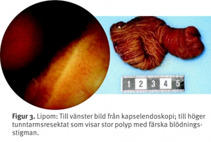 Tre manliga patienter hade metastaser i tunntarmen. Maligna melanom hittades hos två patienter som tidigare hade opererats för maligna melanom i huden. En patient med oklar förändring i tunntarmen genomgick magnetisk resonanstomografi av buken, vilken påvisade hepatocellulär cancer med överväxt mot duodenum. Bland de benigna tumörerna påträffades ett lipom (Figur 3), en hyperplastisk polyp, en pseudopolyp och ett angiolipom. De återstående fyra patienterna har inte blivit opererade.