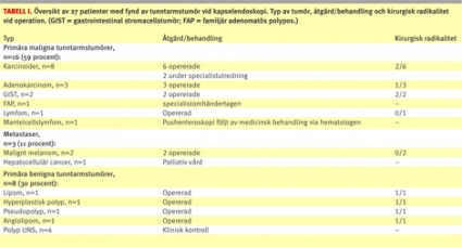 I denna sammanställning fann vi frekvensen tunntarmstumörer vara 12,5 procent hos patienter med oklar gastrointestinal blödning, vilka remitterats för kapselendoskopi. Detta innebär att var åttonde kapselundersökning påvisade en tumör i tunntarmen vid denna indikation.