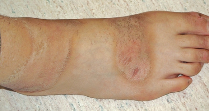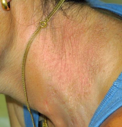 Vid inläggningen hade patienten varit nykter sedan en månad. Hon hade svårt att gå utan kryckor och kunde endast ta enstaka steg utan att falla. Neurologiskt status tydde på sensorisk polyneuropati och myelopati. På handryggarna fanns utslag bilateralt, varför remiss för dermatologisk bedömning utfärdades.