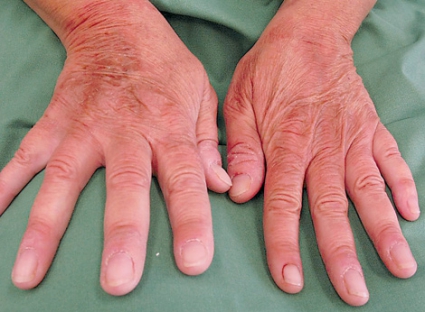 Vid den dermatologiska undersökningen noterades hyperkeratotiska erytematösa plack som täckte större delen av handryggarna bilateralt (Figur 4). Patienten uppgav även att hon haft mycket magbesvär och diarré. Detta gav klinisk misstanke om pellagra.