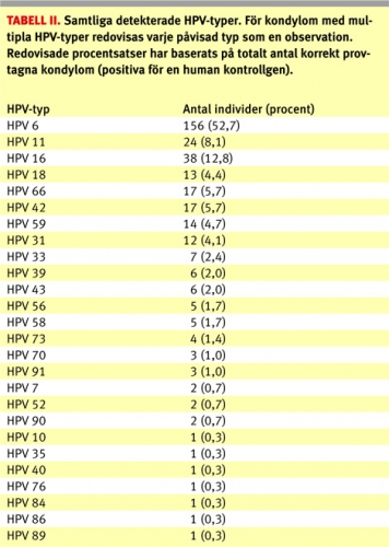 26 olika HPV-typer identifierades i kondylomen (Tabell II). Flertalet av dessa har endast hittats i enstaka prov. Utöver HPV 16 och 18 identifierades högrisktyperna HPV 31, 33, 35, 39, 52, 56, 58, 59 och 73 samt den troliga högrisktypen HPV 66 [1, 13]. Utöver HPV 6 och 11 hittades lågrisktyperna HPV 7, 10, 40, 42, 43, 70, 76, 84, 86, 89, 90 och 91 [1, 13].