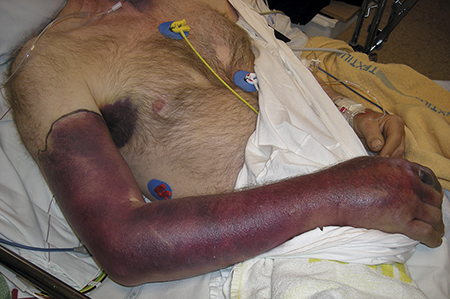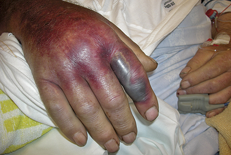 Figur 2. Obehandlat huggormsbett i höger pekfinger där patienten kommit till sjukhus först drygt 2 dygn efter bettet. Utbredd hemorragisk svullnad.