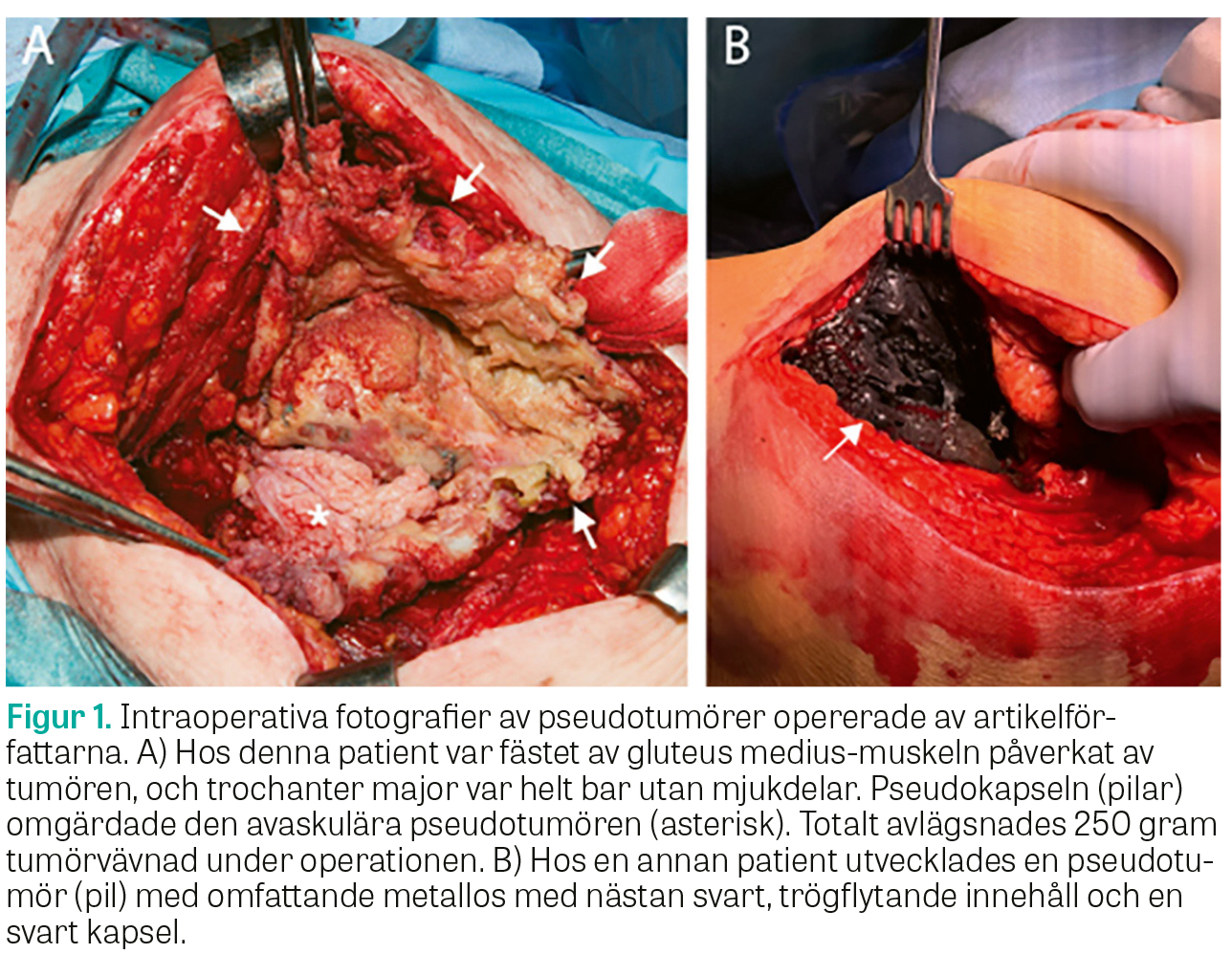 Globalt har över en miljon höftproteser med metall–metallartikulation opererats in. För drygt 10 år sedan publicerades rapporter från nationella register om att dessa proteser oftare än väntat drabbades av tidig revision, bland annat på grund av osteolys, »femoral neck narrowing« (avsmalning av lårbenshalsen), avaskulär nekros och frakturer av lårbenshalsen [2, 3]. En vanlig orsak till revision var utveckling av pseudotumör, som förmodas uppstå på grund av slitagepartiklar från leden och/eller en överkänslighetsreaktion mot metall (Figur 1) [4]. De observerade vävnadsreaktionerna fick flera benämningar: ALVAL (aseptic lymphocytic vasculitis-associated lesions) beskriver den mikroskopiska bilden av överkänslighetsreaktionen, och ALTR (adverse local tissue reactions) och ARMD (adverse reactions to metal debris) är samlingsnamn för ALVAL, pseudotumör och vävnadens reaktion på metalljoner och -partiklar (»metallos«) [5, 6].