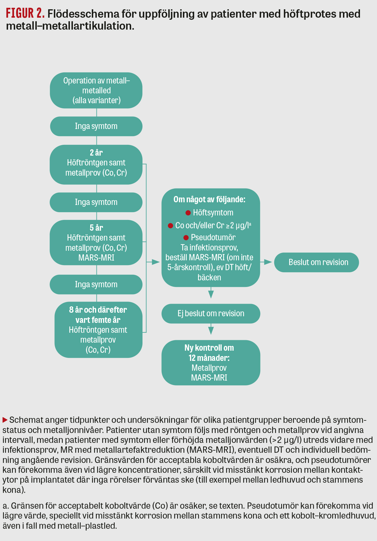 Den ökade revisionsrisken efter insättning av olika typer av höftproteser med metall–metallartikulation har initierat en utveckling av olika strategier för hur dessa patienter bör följas. Riktlinjer för uppföljning har bland annat utgått från USA (Food and Drug Administration, FDA), Europa (European Federation of National Associations of Orthopaedics and Traumatology, EFORT), Storbritannien (Medical and Healthcare Products Regulatory Agency), Australien (Therapeutic Goods Administration) och Kanada (Health Canada). Även i våra nordiska grannländer har man presenterat rekommendationer för uppföljningen av höftprotespatienter med metall–metallartikulationer [10]. I samtliga riktlinjer avser rekommendationerna de patienter som erhållit ytersättningsprotes eller konventionell protes med metall–metallartikulation och ledhuvuddiameter på minst 36 mm. Tidpunkt och intervaller för uppföljning skiljer sig dock mellan de olika direktiv och rekommendationer som refereras här.