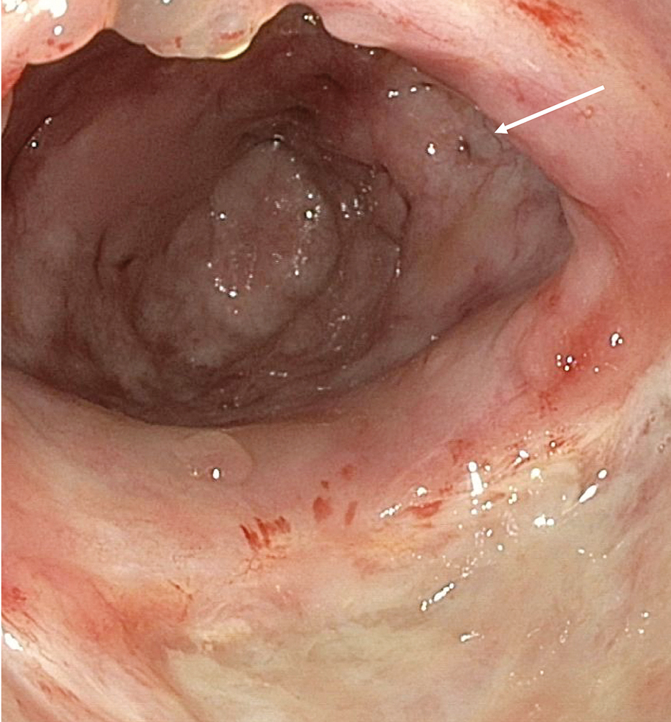 En 69-årig man drabbades av PSA-återfall efter att ha genomgått robotassisterad prostatektomi flera år tidigare. Han behandlades därför med så kallad salvage-strålbehandling innefattande 70 Gy på 35 fraktioner. Med tiden accentuerades uttalade tarmtömningsbesvär, och patienten blev remitterad för koloskopi, där en kronisk strålproktopati sågs och 8 biopsier togs från rektum. Diffusa lokala besvär från ändtarmen och smärtor övergick efter flera månader till allt mindre urinmängder, och misstanke om rektovesikal fistel konfirmerades både palpatoriskt och vid sigmoideoskopi (Figur 1). Han genomgick bäckenutrymning, men drabbades postoperativt av tarmparalys och accepterade inte behandling med ventrikelsond. Efter flera dagar med tarmparalysbild aspirerade patienten ventrikelinnehåll och avled.