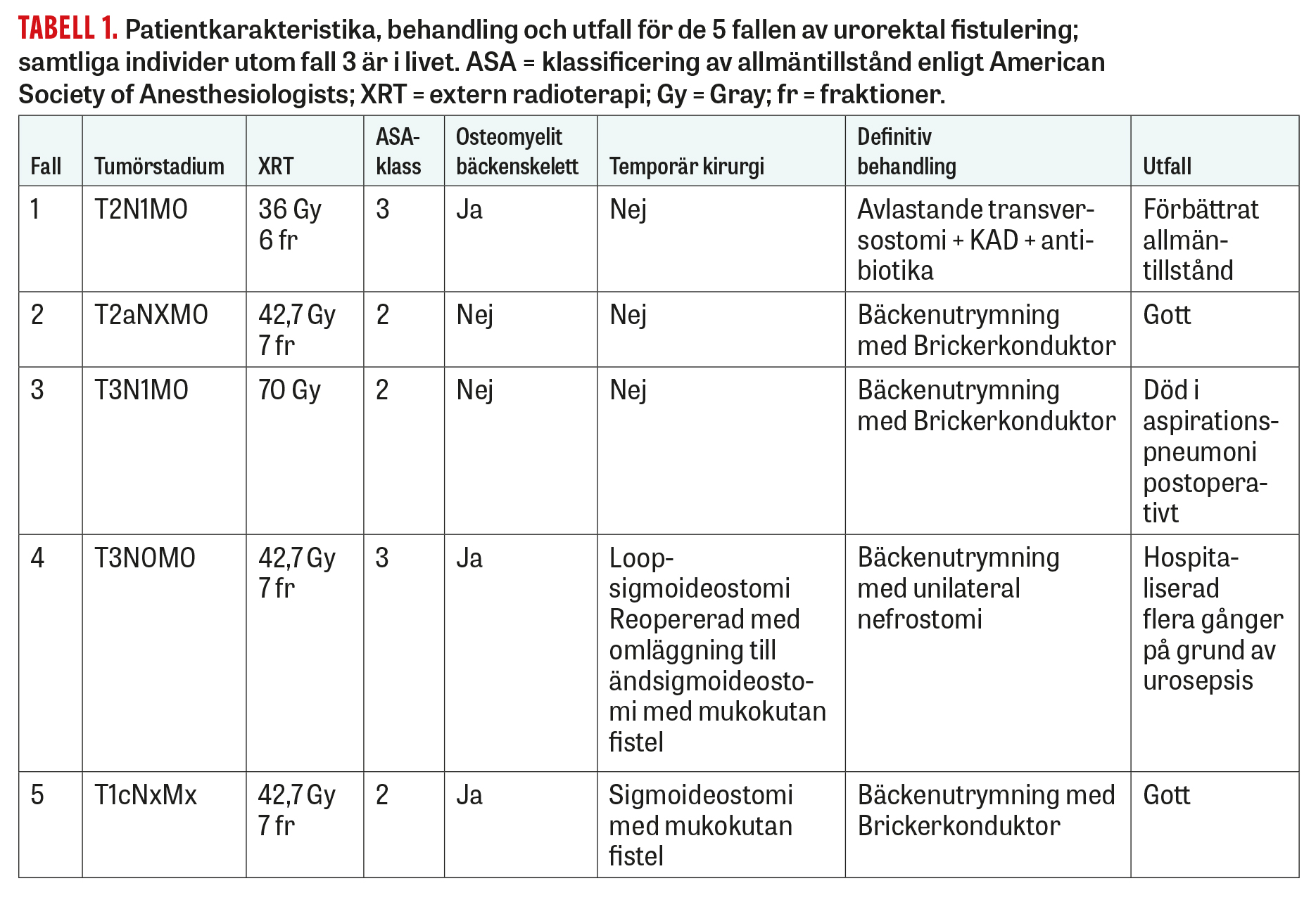 En patient med samsjuklighet i form av adipositas och diabetes erhöll strålbehandling med 42,7 Gy på 7 fraktioner på grund av prostatacancer (cT3N0MX). Efter några år insjuknade han med färsk blödning per rektum. Vid endoskopisk undersökning togs en biopsi från rektum från vad som uppfattades vara strålproktopati. Under inneliggande vård några veckor senare utvecklade patienten anala besvär, feber och fistlar till lår och ljumskar där MR visade fistulering mellan urinblåsa och rektum med fistelsystem ut på huden. Han erhöll en KAD och en loop-sigmoideostomi, men var fortsatt allmänpåverkad och katabol. Efter överföring till Skånes universitetssjukhus omvandlas hans loop-sigmoideostomi till en ändsigmoideostomi och en mukokutan fistel för att undvika passage av avföring till rektum, men trots detta var patienten fortsatt katabol och immobiliserad. Han erhöll därför preoperativt en unilateral nefrostomi och opererades med bäckenutrymning inklusive intersfinkterisk rektumamputation och urinavledning med uretero-uretero-anastomos med urindeviation till den unilaterala nefrostomin |8]. I samband med operationen tas sekventiella benodlingar från symfysben, och osteomyelitomvandlat ben exstirperas.