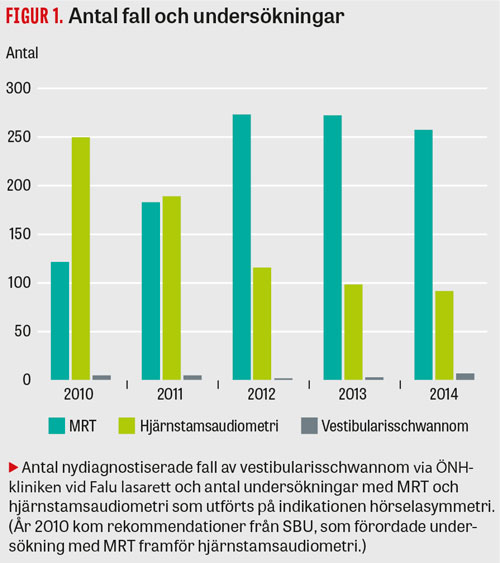 ÖNH-kliniken beställde under 2011–2014 totalt 981 MRT-undersökningar av skallbas/hjärna på indikationen hörselasymmetri. Utöver detta beställde kliniken 67 MRT-skallbas/hjärna med frågeställningen vestibularisschwannom på yrselindikation. Totalt 28 patienter diagnostiserades med vestibularisschwannom under denna period, varav 17 patienter diagnostiserades vid ÖNH-kliniken. Under denna period utförde ÖNH-kliniken i Dalarna 492 undersökningar med hjärnstamsaudiometri på grund av hörselasymmetri.