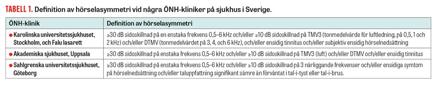 Riktlinjer för att utreda hörselasymmetri vid ÖNH-kliniker på sjukhus i Sverige framgår av Tabell 1. Utöver ensidig sensorineural hörselnedsättning och tinnitus är ostadighet, hydrocefalussymtom (huvudvärk, gångsvårigheter, minnesstörning och förvirring), trigeminuspåverkan och facialispåverkan symtom som kan väcka misstanke om vestibularisschwannom.