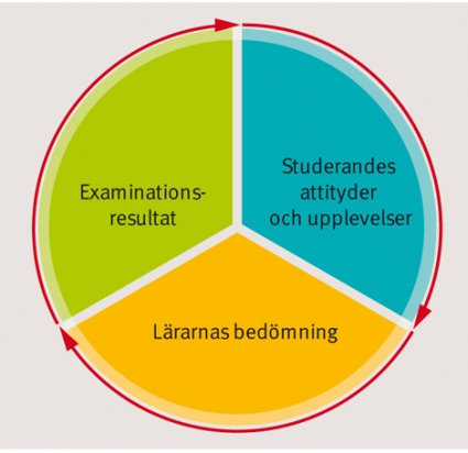I utbildningssammanhang används ofta termen utvärdering, och det instrument som återkommande används är kursvärderingsenkäten. Vi hävdar dock att för att uppnå kriterierna i enlighet med vår definition av utvärdering är det inte tillräckligt att enbart granska kursdeltagares attityder till och upplevelser av en kurs. Att sammanställa resultat från kursvärderingsenkäter uppfyller utvärderingskriteriet »beskriva« men inte »värdera«. Utvärdering ska betraktas som ett pedagogiskt redskap som hjälper oss att beskriva och värdera kurser men som också stimulerar till kvalitetsutveckling. För att uppnå detta behöver resultaten från kursvärderingsenkäten kombineras med andra data, som examinationsresultat och lärarnas bedömningar (Figur 1). På detta sätt kan en kursutvärdering genomföras. Strävan är att inte enbart säkra kvaliteten utan även utveckla den [6]. Kombinationen av olika typer av data ger oss en mer mångfasetterad bild av utbildningsmomentet och större möjligheter till utvecklande insatser. Kursdeltagarnas upplevelse av utbildningens relevans är dock långt ifrån oviktig; upplevelsen av relevans är en av de mest centrala förutsättningarna för att lärande ska kunna utvecklas hos en vuxen individ [7].