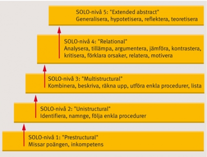 Ett genomgående tema i utvärderingen har även varit att värdera i vilken utsträckning utbildningen har påverkat kursdeltagarnas lärandenivåer. Den kunskapstaxonomi (klassificeringsmodell för kunskapsnivåer) vi valt att använda för att belysa och förtydliga deltagarnas nivå av kunskaper är John Biggs SOLO-taxonomi. Utan att gå alltför djupt in i taxonomins konstruktion innebär de tre första stegen ett kvantitativt tillskott av nya kunskaper och informationsbitar samt förmåga att kombinera dem. Ju närmare en person rör sig mot nivå fem, den glidande skalans extrempunkt, desto högre kvalitativ (kognitiv) förståelse har han/hon av ett visst fenomen. Skalan är hierarkisk, vilket betyder att personer som befinner sig där de kan generalisera förståelsen till en ny domän har all den faktakunskap som de föregående fyra nivåerna förutsätter [8] (Figur 2).