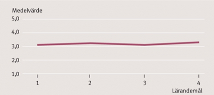 Svarsfrekvensen på kursvärderingsenkäten var 93 procent (n = 15), och deltagarnas upplevelse var att de överlag uppnådde kursens lärandemål »till viss del« (svarsalternativ 3) (Figur 4). Kursdeltagarna ansåg att tydligare information om inlämningsuppgifter, tydligare kommunicerat syfte, handledning i samband med gruppuppgifter, förbättrad logistik kring kursen och en minskad total arbetsbörda under veckan skulle kunna ha bidragit till att man uppnått kursens lärandemål i större utsträckning.