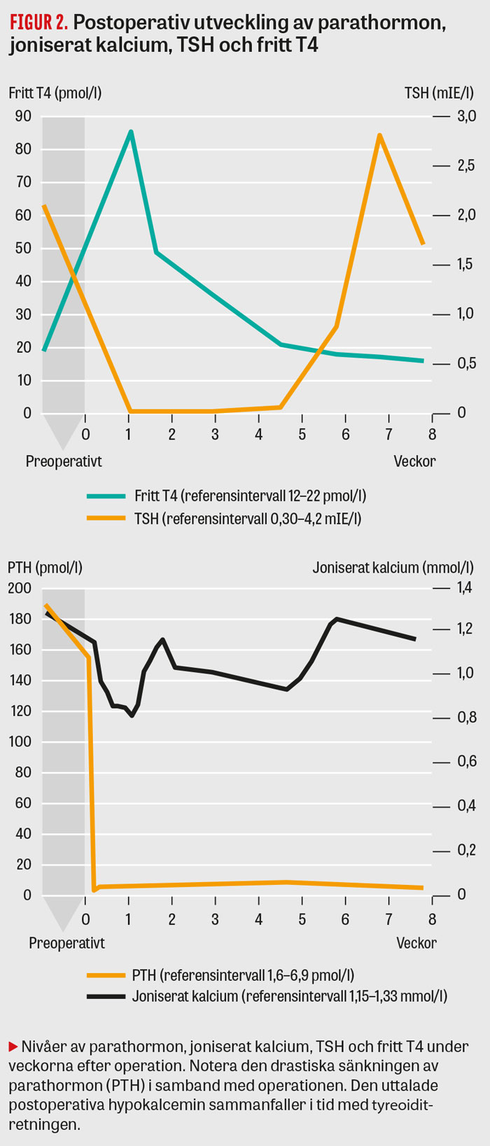 En 70-årig man behandlades i väntan på njurtransplantation med peritonealdialys på grund av kronisk njursvikt (stadium 5) på basen av IgA-nefrit. Han hade vidare en tablettbehandlad hypertoni, hyperlipidemi och ett konservativt behandlat bukaortaaneurysm. Han hade ingen tidigare känd sköldkörtelsjukdom. Trots intensiv behandling med fosfatbindare (sevelamer) och aktivt vitamin D (alfakalcidol) hade han utvecklat en behandlingsrefraktär sekundär hyperparatyreoidism där PTH successivt stigit till 190 pmol/l (referensvärde 1,6–6,9 pmol/l). Efter diskussion på multidisciplinär konferens beslöt man om subtotal paratyreoidektomi med borttagande av 3,5 bisköldkörtlar. Patienten klarade ingreppet väl, PTH gick ner från 156 till 4,1 pmol/l på ett dygn och han kunde utskrivas till hemmet nästföljande dag. Dagen efter sökte han på grund av yrsel, hjärtklappning och feberkänsla. Undersökning visade puls 120 slag/minut, systoliskt blodtryck 80 mm Hg och temperatur 38,1 °C. Provtagning visade CRP 110 mg/l (referensvärde < 5 mg/l), LPK 10,1 × 109 g/l (referensvärde 3,5–8,8 g/l) och joniserat kalcium 0,98 mmol/l (referensvärde 1,15–1,33 mmol/l). Inga infektionssymtom framkom mer än lätt rodnad och ömhet vid operationssåret. På grund av dehydrering och misstänkt begynnande postoperativ sårinfektion lades patienten in för uppvätskning, justering av kalciumnivåer och peroral antibiotikabehandling med klindamycin. Efter två dagar hade rodnaden i såret försvunnit. Den postoperativa hypoparatyreoidismen var svårhanterlig, med ett joniserat kalcium på 0,82 mmol/l en vecka postoperativt trots höga doser kalcium och alfakalcidol. Även CRP fortsatte stiga till 200 mg/l trots antibiotika. På sjunde postoperativa dagen kontrollerades tyreoideastatus, vilket visade TSH 0,02 mIE/l (referensvärde 0,30–4,2 mIE/l) och fritt T4 85 pmol/l (referensvärde 12–22 pmol/l). Tyreoideaperoxidas- och tyreotropinreceptorantikroppar låg inom referensvärden. Tyreoideaskintigrafi visade inget upptag på platsen för tyreoidea (Figur 1). Den sammantagna bilden talade för en postoperativ tyreoidit. Då patienten hade normal puls och biokemiska parametrar gick i normaliserande riktning (Figur 2) avstods från ytterligare behandling. Den initialt svårbehandlande hypokalcemin förbättrades successivt med kalcium och D-vitamin och i takt med tyreoiditens utläkning. Sex veckor efter operation hade patientens tyreoideastatus och PTH normaliserats. Patienten kvarstod på låga doser kalcium och aktivt vitamin D i samma dos som inför operationen. Kalciumnivåer låg inom normalområdet (Figur 2). Histopatologisk analys visade hyperplasi utan atypi.