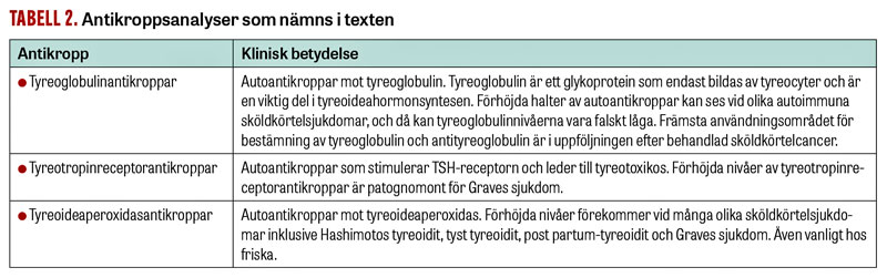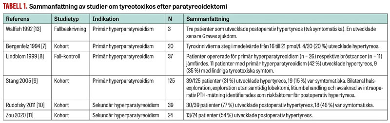 Det ovan presenterade sjukdomsförloppet illustrerar en utsvämningstyreoidit efter paratyreoideakirurgi, svårigheterna att komma till korrekt diagnos där man initialt misstolkade bilden som postoperativ infektion och hur det senare präglade handläggningen. Tyreoideahormonpåverkan efter paratyreoideakirurgi är inte okänt, och frekvensen hypertyreos/hypertyroxinemi efter kirurgi för primär hyperparatyreoidism har rapporterats till mellan 20 och 42 procent [7-9], de flesta asymtomatiska. Samtidig litiumbehandling och bilateral halsexploration har angivits som oberoende riskfaktorer för postoperativ hypertyreos, medan samtidig hemityreoidektomi skyddar [9]. Vid sekundär hyperparatyreoidism är situationen sämre studerad, men i två studier av totalt 63 individer opererade för sekundär hyperparatyreoidism rapporteras hypertyroxinemi hos 43 (68 procent) [10, 11]. Samtidiga tyreotoxiska symtom, oftast av lindrig karaktär, rapporterades i en studie hos 18 av 39 patienter (46 procent) [10] (Tabell 1). Postoperativ tyreoidit med uttalad tyreotoxikos som presenteras här syns dock ovanlig; enligt vår kännedom finns endast fem tidigare rapporterade fall, samtliga efter operation för sekundär paratyreoidism [12-16].