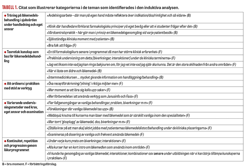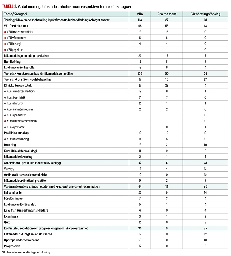 Sammanlagt 162 meningsbärande enheter speglade bra moment, och 180 utgjorde förbättringsförslag. Totalt 226 (66 procent) enheter återfanns inom två teman: »Träning på läkemedelsbehandling i sjukvården under handledning och eget ansvar« samt »Teoretisk kunskap som bas för läkemedelsbehandling« (Tabell 2). Inom dessa teman utgjorde 87/118 (74 procent) respektive 55/108 (51 procent) enheter bra moment. Inom resterande tre teman speglade merparten av de meningsbärande enheterna förbättringsförslag: »Varierande undervisningsmetoder med krav, eget ansvar och examination« (30/44, 68 procent), »Att ordinera i praktiken med stöd av verktyg« (31/37, 84 procent), respektive »Kontinuitet, repetition och progression genom läkarprogrammet« (35/35, 100 procent). Flest meningsbärande enheter av typen förbättringsförslag noterades dock i temat »Teoretisk kunskap som bas för läkemedelsbehandling« (n = 53).