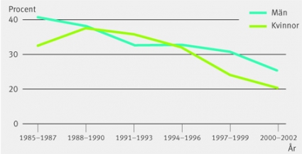 I flera avseenden har utvecklingen varit mer gynnsam för män än för kvinnor. Mest tydligt är detta för rökvanor. Sverige är ett av de få länder där klart fler kvinnor än män röker [15]. Män i norra Sverige hade den lägsta andelen rökare vid MONICAs start, och andelen rökare har därefter minskat ytterligare. Även om färre kvinnor röker nu jämfört med mitten av 1990-talet så har gapet mellan könen bibehållits [16].