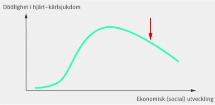 Utvecklingen av hjärt–kärlsjukdom, som den avspeglas i MONICA, följer en mer generell modell, epidemiologisk transition, för hur åldersrelaterade sjukdomar som hjärtinfarkt och stroke långsiktigt utvecklas i en befolkning (Figur 5) [19]. Från en extremt låg risk bland ursprungsbefolkningar med bevarad livsstil så ökar risken med ökande ekonomisk utveckling. De högsta riskerna finns i medelinkomstländer, idag till exempel i Östeuropa. Med ytterligare välstånd sjunker risken för död i hjärtinfarkt och stroke, beroende delvis på lägre incidens, delvis på förbättrad sjukvård och lägre dödlighet på både kort och lång sikt. När MONICA inleddes för 20 år sedan hade norra Sverige, i likhet med de flesta befolkningar i Västeuropa, Nordamerika och Australien, redan passerat toppen på dödlighetskurvan.