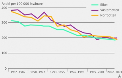 När MONICA-projektet startade låg norra Sverige klart över riksgenomsnittet i död i hjärt–kärlsjukdom, särskilt då i åldrarna under 65 år. Dödligheten har sjunkit i hela landet [8]. Men minskningstakten har varit klart snabbare i Norr- och Västerbotten än i resten av Sverige och nu är norra Sverige ikapp andra delar av landet (Figur 3). Men granskar man närmare hur hjärtinfarktrisken är fördelad inom Norrbotten och Västerbotten så finns fortfarande stora geografiska ojämlikheter. Också sedan man korrigerat för ålderssammansättning löper boende i glesbygdsområdena cirka 50 procent högre risk än boende i Umeåområdet att insjukna i hjärtinfarkt.