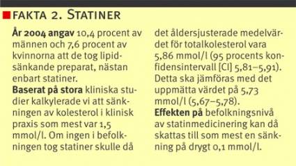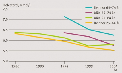 Kan minskad incidens och mortalitet tillskrivas förändringar i traditionella riskfaktorer? Den mest imponerande förändringen har gällt kolesterolet, som sjunkit med cirka tio procent (Figur 4, opublicerade data). Beräkningar vid 1990-talets slut (då fortfarande alla statiner var patentskyddade och dyra) visade att man, om man översatte MONICA-resultaten till hela den svenska befolkningen, skulle behöva spendera 16 miljarder årligen på läkemedel för att åstadkomma samma kolesterolsänkning som »spontant« inträffade i norra Sverige. Men förändringarna var naturligtvis inte spontana. De berodde på ändrade kostvanor. Norrbottningarna och västerbottningarna övergick till lågfettsalternativ bland mejeriprodukter, och man gick från mättat till omättat fett i kosten. Behandling med statiner bidrar i ringa utsträckning till sänkningarna även om cirka 10 procent behandlades med sådana år 2004 (Fakta 2).