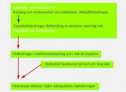 Figur 6 är ett försök att mycket översiktligt sammanfatta de olika bestämningsfaktorerna för död i hjärt–kärlsjukdom. Det samhälleliga och sociala sammanhanget är av grundläggande betydelse.