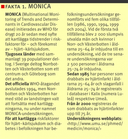 När landstingspolitikerna i Norr- och Västerbotten för två decennier sedan beslöt att stödja att norra Sverige skulle gå in i WHOs då nystartade MONICA-projekt, gjorde man det utifrån en insikt om hur dominerande hjärt–kärlsjukdomarna var som dödsorsak och hur stor potential det fanns för förbättringar. Beslutet har visat sig vara framsynt. Hjärt–kärldödligheten gick verkligen att påverka, kanske till och med mer drastiskt än man kunde hoppas.