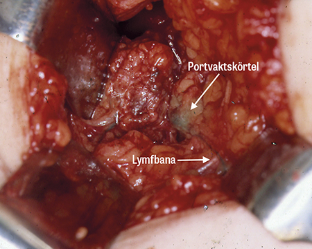 Portvaktskörteln är den första lymfkörteln dit lymfan från ett tumörområde dräneras. En spridning av cancerceller sker oftast först till denna körtel. Är den fri från tumörceller är i allmänhet även övriga lymfkörtlar i armhålan det. Identifikation av portvaktskörteln sker med en kombination av isotop (99Tc-nanokolloid) och blå färg (Patent blue, Guerbet) som injiceras intill tumören. Exakt hur injektionen görs varierar mellan intratumoralt, peritumoralt, subkutant, intrakutant och subareolärt. Samtliga tekniker har sina förespråkare och alla fungerar. Vid ytlig injektion sker spridningen i lymfbanorna snabbare, medan djup injektion påvisar fler körtlar belägna utanför axillen [20, 21]. Dessa kan påvisas med hjälp av preoperativ skintigrafi. Detta utförs dock inte i klinisk rutin då nödvändigheten av att hitta körtlar utanför axillen har ifrågasatts. Det är sällsynt att dessa är metastatiska utan att det finns metastaser även i axillen, och kirurgiskt borttagande av parasternala körtlar har vid långtidsuppföljning inte visats påverka överlevnad [22]. En metaanalys har visat positiv effekt på sjukdomsfri och total överlevnad av strålbehandling mot parasternala körtlar [23]. Med en handhållen gammaprob kan portvaktskörteln påvisas i axillen, och visuellt ser man den oftast som klart blåfärgad. I majoriteten av fallen finns mer än en portvaktskörtel (i genomsnitt 2) beroende på parallella lymfbanor. Portvaktskörteln tas ut och skickas för histologisk undersökning. Tidigare utfördes snabbundersökning med fryssnitt under operation för att fortsätta operationen med axillutrymning i samma seans om portvaktskörteln var metastatisk. Allt mer har dock behovet av axillutrymning börjat ifrågasättas vid positiv biopsi av portvaktskörteln, vilket har gjort att behovet av fryssnitt också minskat. På många kliniker i Sverige avstår man i dag från fryssnitt.