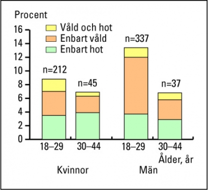 I undersökningen »Slagen dam« uppges att nästan varannan kvinna (46 procent) efter 15-årsdagen utsatts för våld av en man och att 22 procent utsatts för våld under det senaste året [12]. Dessa siffror stämmer med vad man funnit i andra studier, även från andra länder [10, 15, 16]. Statistiska centralbyrån (SCB) har sedan 1978 gjort upprepade intervjuundersökningar om förekomsten av våld eller hot om våld hos både män och kvinnor. En markant ökning har noterats från början av 1990-talet, och under 2000–2001 hade 7,6 procent av befolkningen utsatts för våld eller hot om våld [17]. Unga kvinnor och män var generellt mer utsatta. Efter 25 års ålder var kvinnor mer utsatta än män.