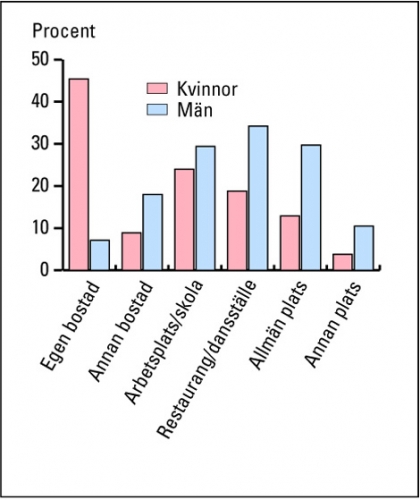 Figur 2 visar var våldet ägt rum. Den enskilt farligaste platsen för kvinnan var hemmet, medan mannen huvudsakligen utsattes för våld eller hot på arbetsplatsen, restaurang/dansställe eller någon allmän plats.