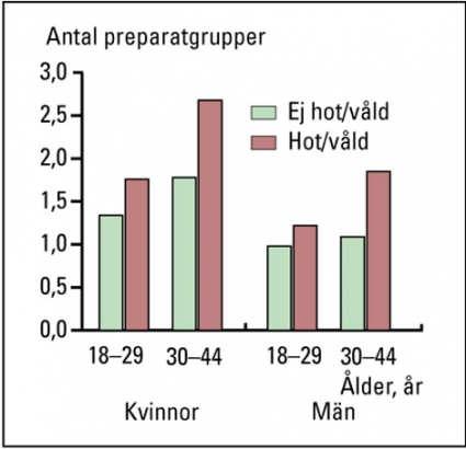 I Figur 3 redovisas bruket av olika läkemedel eller preparat som den som besvarade enkäten använt under de senaste två veckorna. Både kvinnor och män som uppgivit att de utsatts för våld/hot hade använt signifikant fler preparat ur de flesta preparatgrupper än de som inte utsatts, tex hostmedicin, astmamedicin, vitaminer, smärtstillande medel med eller utan recept, magsårsmedicin, sömnmedel och naturläkemedel.