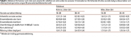 I Tabell I redovisas sambandet mellan socioekonomiska variabler och rökning och rapportering om våld/hot om våld. För kvinnor var risken att bli utsatt för våld/hot störst bland dem som var ensamstående med barn – i gruppen 18–29 år uppgav 26 procent att de utsatts för våld eller hot om våld under senaste året. Kort utbildning och dålig ekonomisk förmåga samvarierade med hög risk för att bli utsatt för våld/hot. För män syntes de sociala variablerna ha mindre betydelse – viktigast var civilståndet där ensamstående män utan barn var mest utsatta.