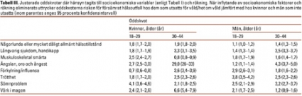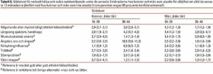 I Tabell II visas svaren på frågor om hälsotillstånd i relation till uppgifter om fysiskt våld eller hot om våld. Framför allt kvinnor som utsatts för våld/hot rapporterade en väsentligt ökad ohälsa. Efter kontroll med multivariat logistisk regression för socioekonomiska faktorer och rökning (Tabell I) kvarstod den förhöjda risken för ohälsa för dem som utsatts för våld/hot, men skillnaden mellan män och kvinnor hade minskat (Tabell III). Risken för oro/ångest hade ökat markant för kvinnor i åldern 30–44 år och var 29 gånger vanligare hos dem som utsatts för våld/hot än hos dem som inte utsatts.