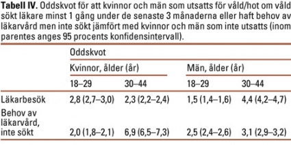 Vår undersökning visar att både kvinnor och män som utsatts för våld/hot oftare sökt läkare än de som inte varit utsatta – de har också oftare haft behov av läkarvård men inte sökt läkare, kvinnor i åldern 30–44 år hade en oddskvot på 6,9. Detta kan möjligen tolkas som att de inte vågar ta upp vad som hänt dem, eller inte tror att de ska få någon hjälp, och därför inte söker hjälp i den utsträckning som de själva bedömer att de skulle behöva.