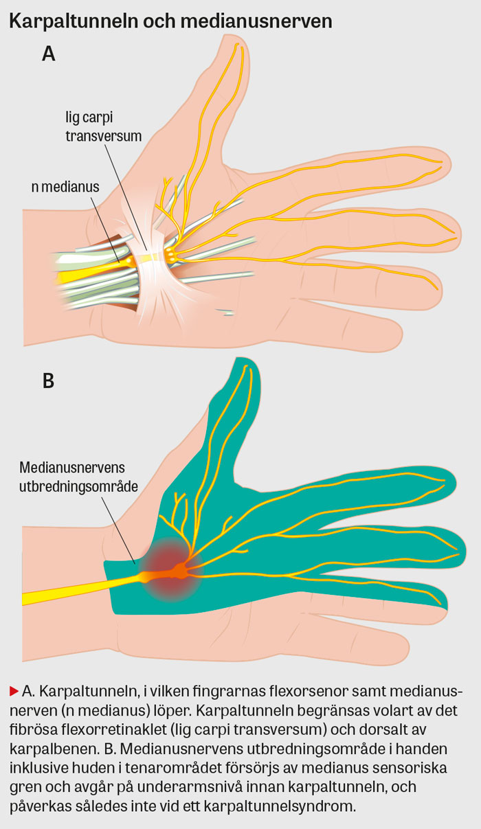I karpaltunneln passerar medianusnerven tillsammans med fingrarnas 9 flexorsenor och begränsas volart av ett fibröst flexorretinakel (ligamentum carpi transversum) och dorsalt av karpalbenen [8]. Karpaltunnelsyndrom utvecklas på grund av en tryckstegring i karpaltunneln med kompression av medianusnerven. Tryckstegringen kan bero på systemsjukdom (till exempel diabetes mellitus eller hypotyreos), processer som orsakar volymreduktion (till exempel ödem, blödning eller tenosynovit), graviditet och sekundärt till trauma [5, 9].