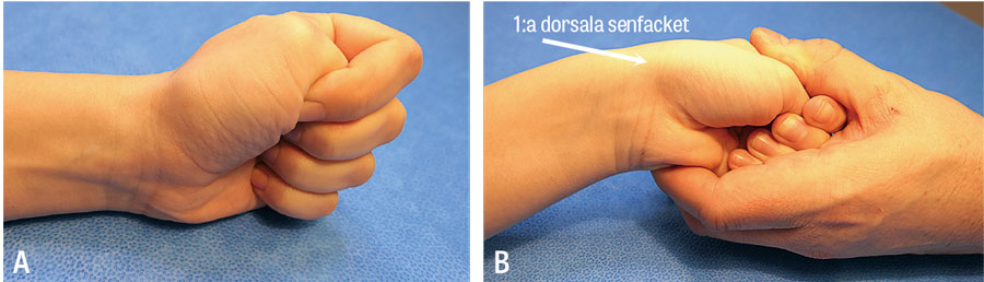 B. Därefter ulnardevieras handleden passivt, vilket utlöser lokaliserad smärta över 1:a dorsala senfacket vid positivt test. Jämfört alltid med kontralateral sida.