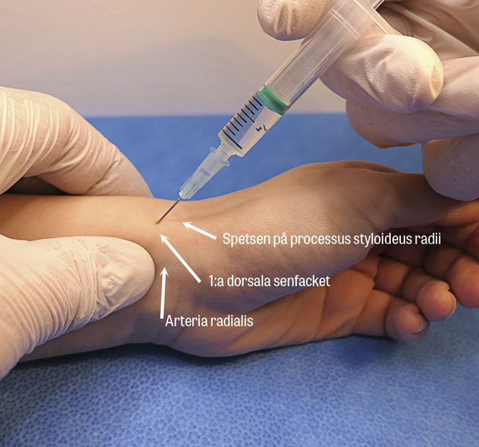 Injektionsteknik vid behandling av morbus de Quervain. Palpera ut spetsen på processus styloideus radii, 1:a dorsala senfacket ligger precis proximalt därom. Markera gärna insticksstället i huden med spetsen på en penna (skrivspetsen inne i pennan) vilket ger en liten rund ring i huden. Greppa dorsalt och volart på processus styloideus radii, och därmed avgränsas första 1:a dorsala senfacket och arteria radialis skyddas (med tummen på bilden). Stick ner till ben, backa lite, och injicera om det är där smärtan uppges. Annars, rikta om utan att ta ut nålen tills rätt område träffas (det smärtande området).