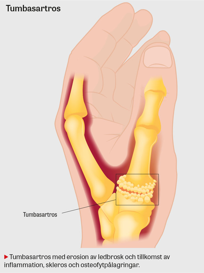 Tumbasartros är en progressiv, degenerativ ledsjukdom med engagemang av karpometakarpal (CMC) 1-leden. Artrosutvecklingen kännetecknas av succesiv erosion av ledbrosket. Dessutom uppstår inflammation i ledkapseln med successivt ökande stelhet som följd. Det subkondrala benet förhårdnar (skleros) och ny benutväxt (osteofyter) tillkommer runt ledytorna. Hereditet, tidigare trauma, kvinnligt kön (på basis av generell hypermobilitet och könshormoner) samt intraartikulära infektioner i CMC 1-leden är faktorer som kan orsaka erosion av ledbrosket [23, 24].