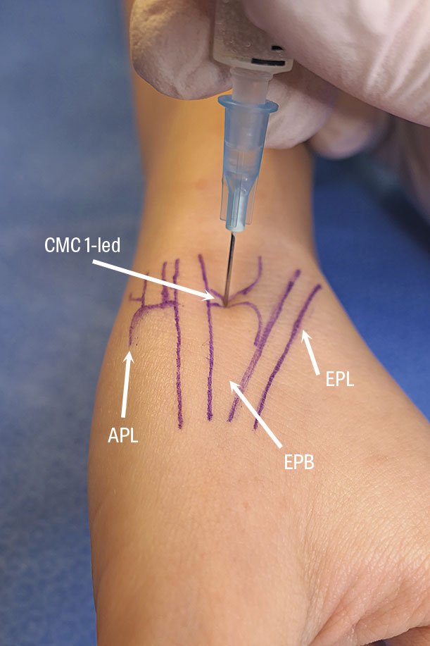 Injektionsteknik vid tumbasartros i CMC (karpometakarpal) 1-led. Be patienten sträcka hela tummen och identifiera mellanrummet mellan musculi extensor pollicis longus (EPL) och extensor pollicis brevis (EPB). Patienten slappnar av, och ett grepp läggs om tummen. Anlägg traktion, samtidigt som patienten motdrar med armen utan att spänna tummen, och CMC 1-leden vidgas. Med pennspetsen palperas ledspringan fram. Ofta känns kanten på basen av grundfalangen tydligt varefter det blir ett »litet hopp« när man går över kanten och hamnar i ledspringans fördjupning i huden. Injicera därefter i CMC 1-leden (det smärtande området). (APL = abductor pollicis longus.)